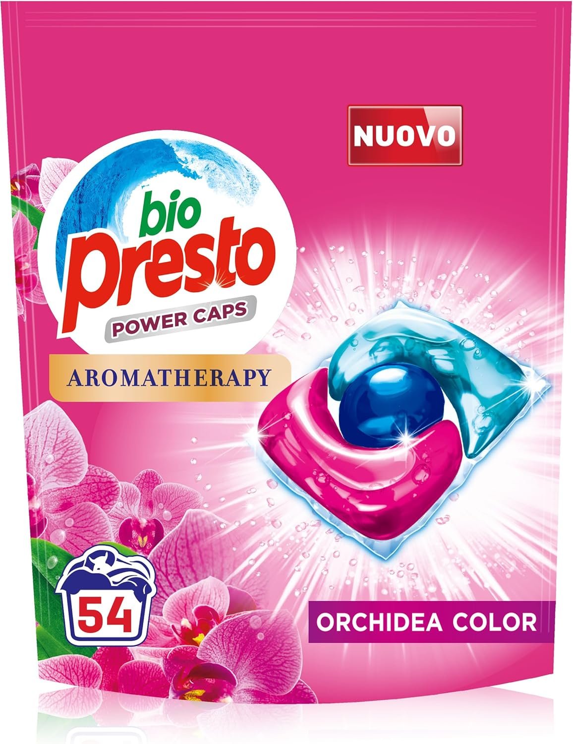 La Bio Presto Power Caps Color presa in esame include è quella Orchidea Color. Questa formula unisce un’azione pulente profonda, studiata per conservare l’intensità delle tinte sui tessuti, a un profumo floreale.